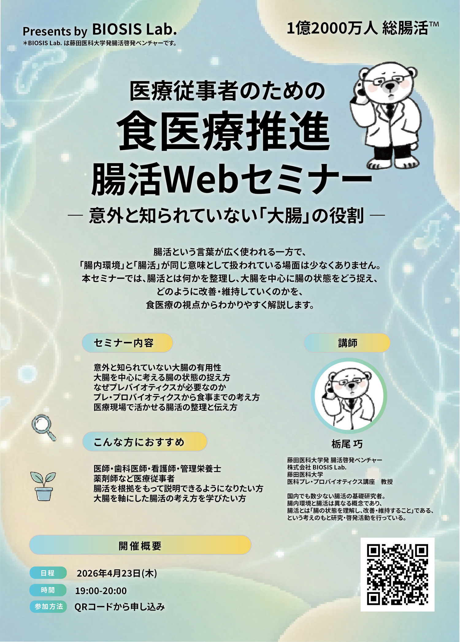 大腸を中心とした腸の役割や、プレ・プロバイオティクスの基礎、医療現場での伝え方までを体系的に学びます。